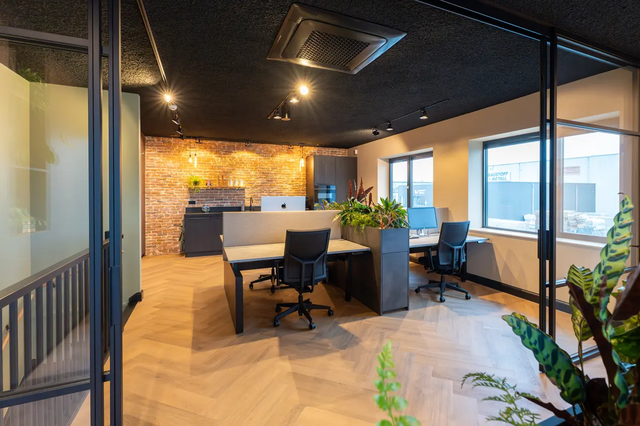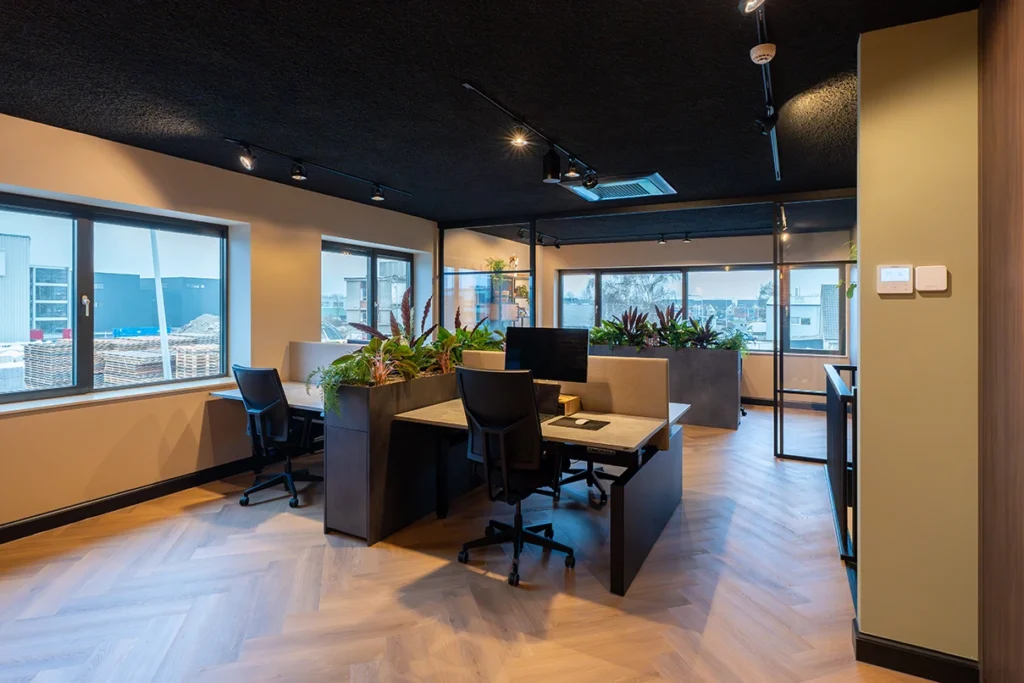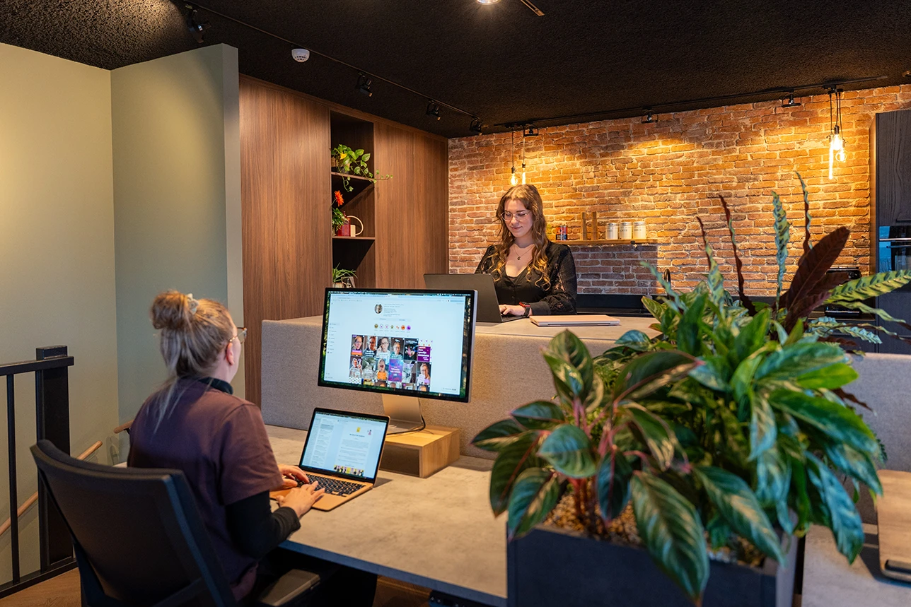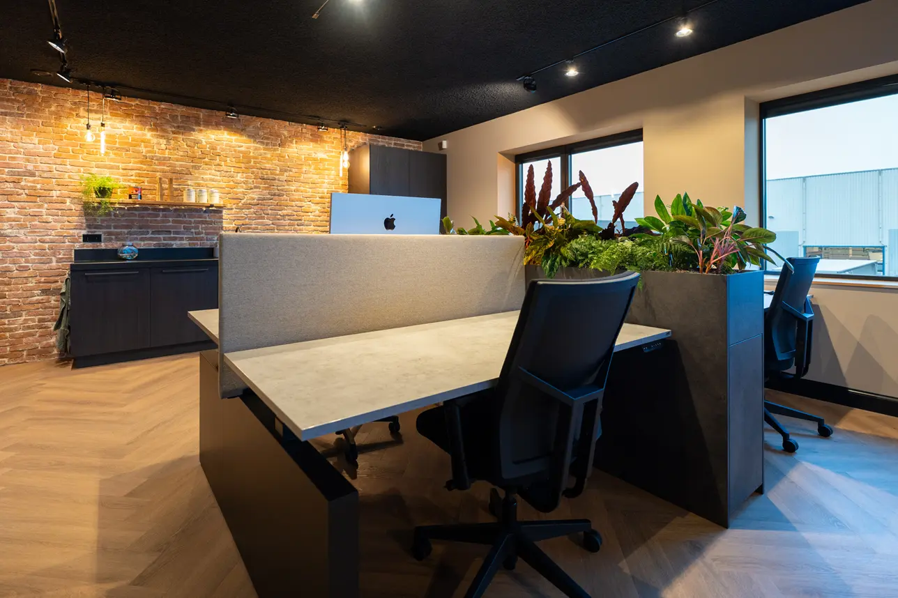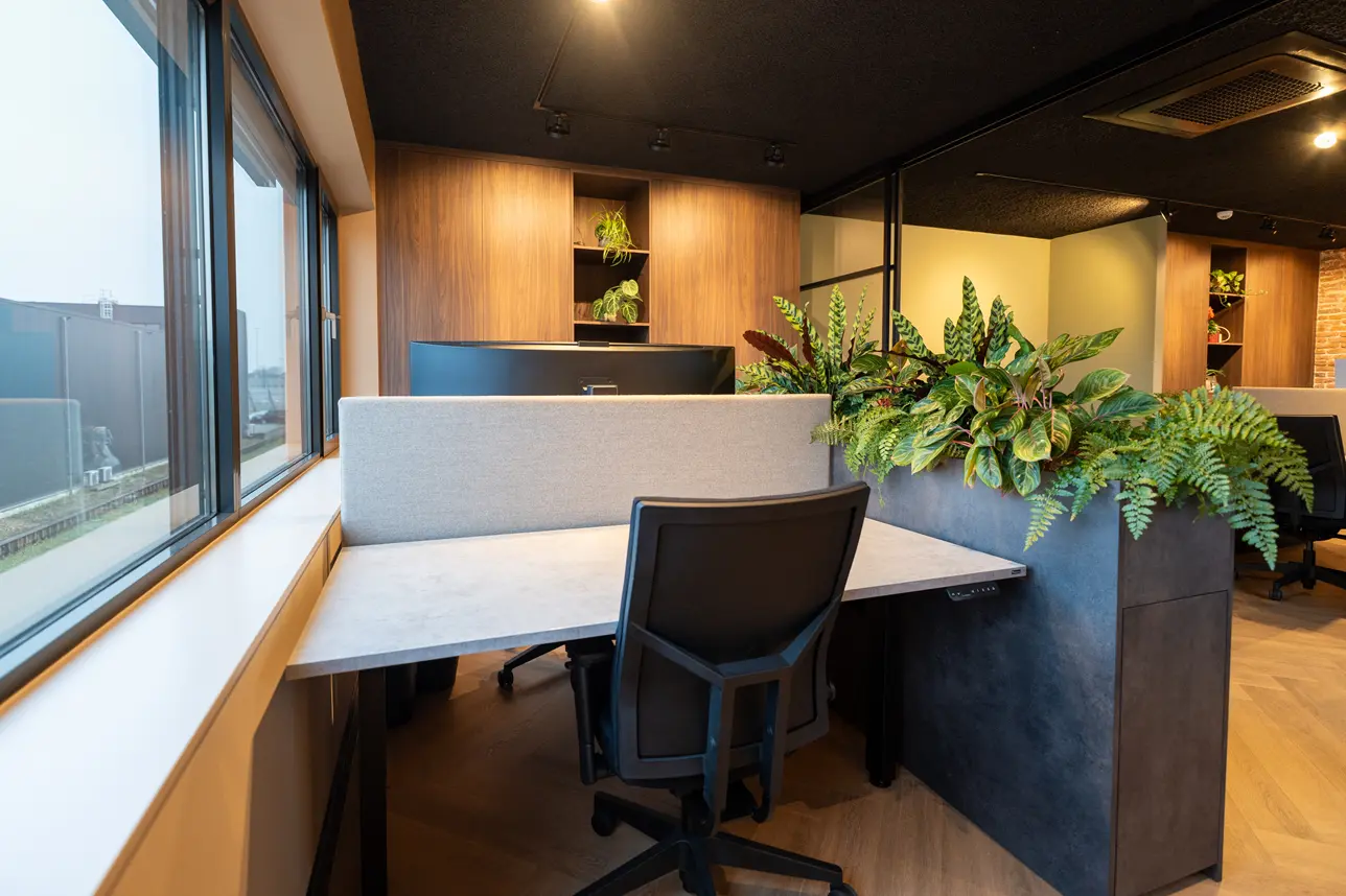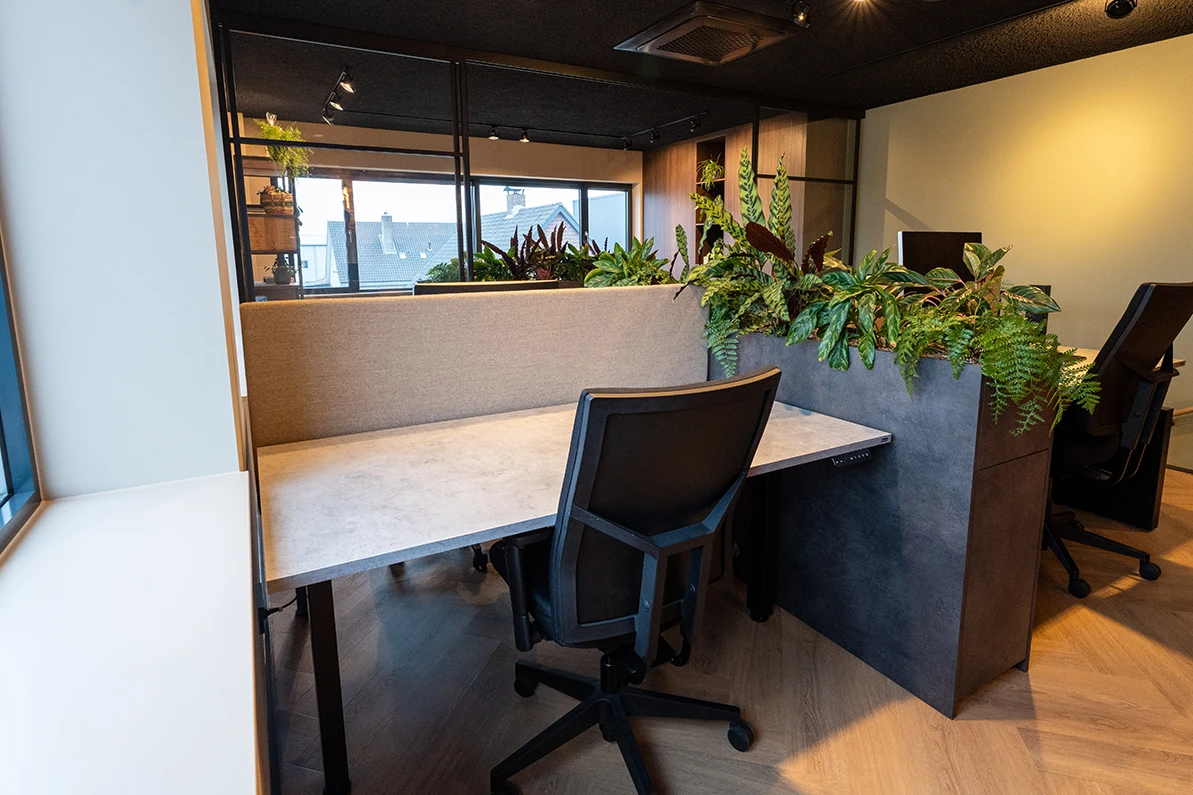De werkplekken zijn ruim opgezet en gescheiden door brede plantenbakken, waardoor je voldoende privacy hebt.