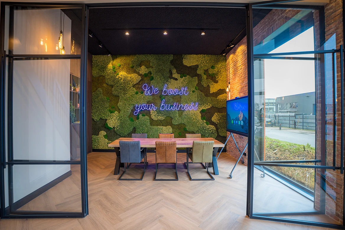 Er is een afsluitbare meeting room van ruim 20 m², met een verrijdbaar scherm dat whiteboarden, draadloos presenteren en hybride vergaderen mogelijk maakt.