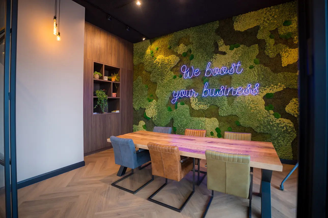 De werkplekken zijn ruim opgezet en gescheiden met plantenbakken, waardoor je veel privacy hebt. Voor langere calls of online meetings kun je de afgesloten meeting room